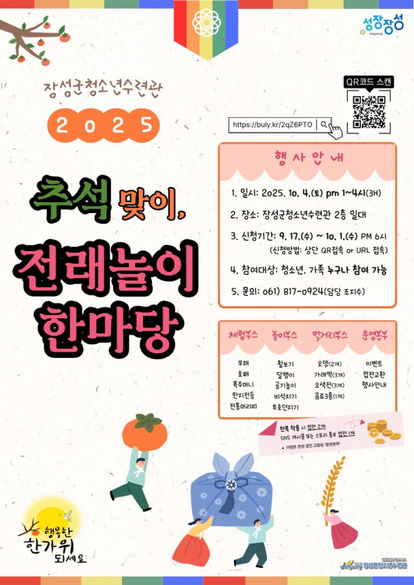 1. 일시: 2025. 10. 4.(토) PM 1~4(3H) 2. 장소: 장성군청소년수련관 2층 일대 3. 신청 기간: 9. 17.(수) ~ 10. 1.(수) PM 6시 4. 참여 대상: 청소년, 가족 누구나 참여 가능 <엽전 이벤트> -한복 착용 시 엽전 2개 -SNS 홍보 게시물 또는 스토리 업로드 시 엽전 1개 <추억의 뽑기 이벤트> -엽전 1개 당 1개의 뽑기 기회 제공 (꽝 없음 주의!!)