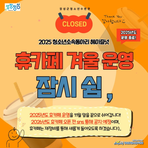2025년도 청소년소속동아리 헤이즐넛이 운영하는 '휴카페' 전달사항 입니다~! 12월부터 내년 겨울 기간동안 휴카페 재정비 기간으로 운영을 잠시 쉬게 되었습니다