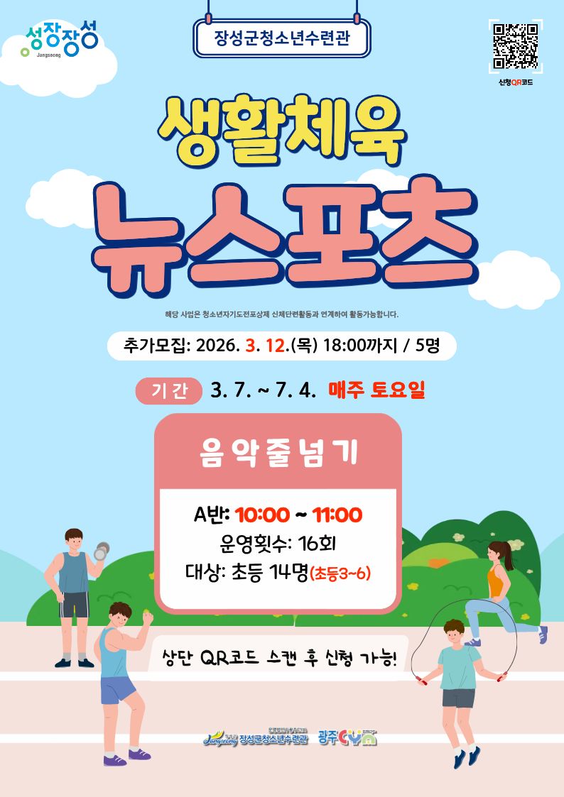안녕하세요. 장성군청소년수련관입니다. 장성군청소년수련관에서는 청소년들의 건강한 신체활동을 위해 생활체육 뉴스포츠 프로그램을 운영합니다. 음악에 맞춰 즐겁게 운동하는 음악줄넘기 A반 참가자를 아래와 같이 추가 모집하오니 많은 관심과 신청 바랍니다.