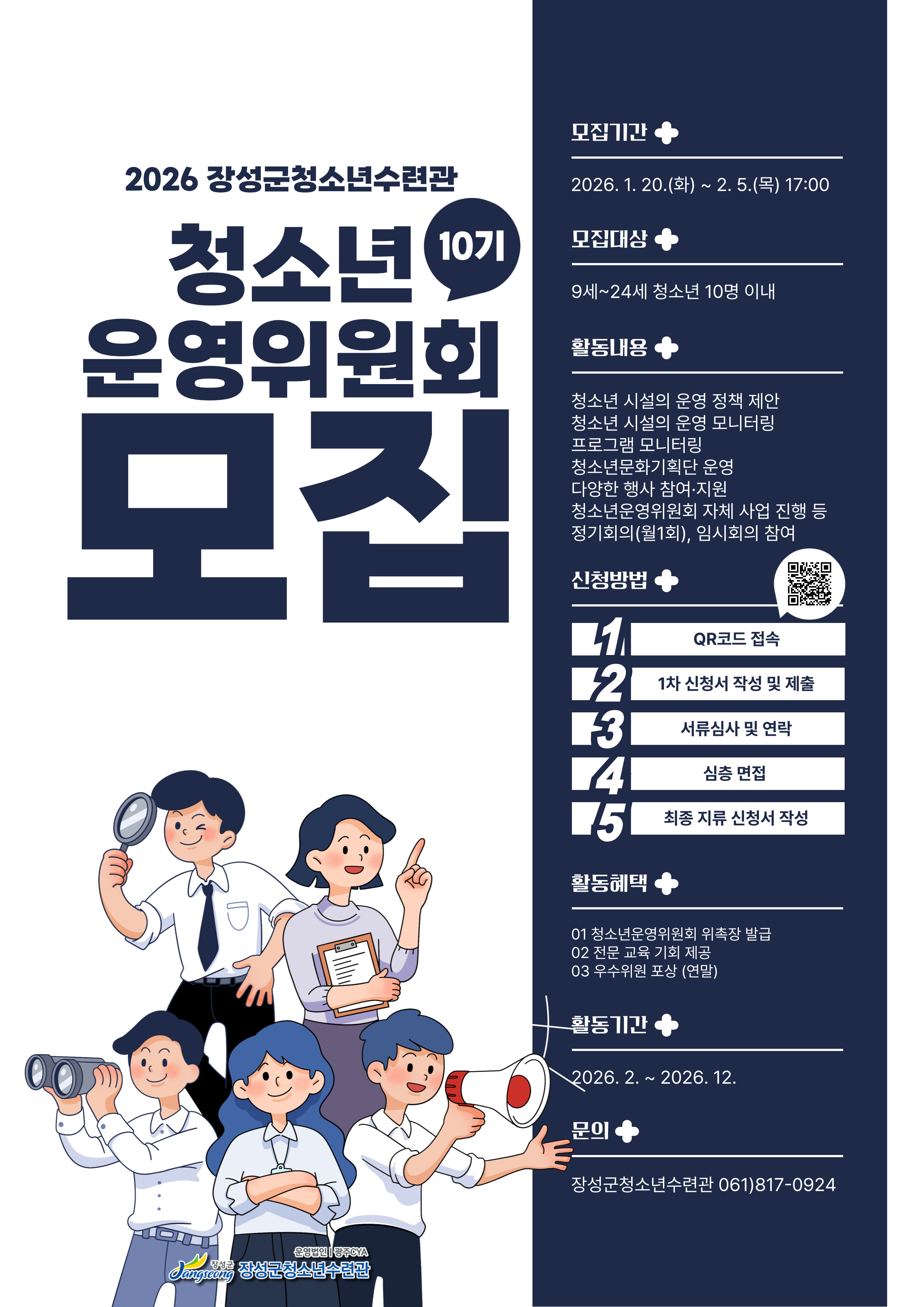 청소년이 주체적으로 청소년시설 운영 및 프로그램에 대해 모니터링과 함께 다양한 의견 및 요구를 제안함으로써 청소년시설 운영의 효율성을 높이고자 장성군청소년수련관 "2026 장성군청소년수련관 청소년운영위원회"를 모집하오니 관심 있는 청소년들의 많은 참여 부탁드립니다. 모집기간: 2026. 1. 20.(화) ~ 2. 5.(목) 17:00까지 모집대상: 장성군 내에 주민등록이 되어있는 초·중·고·대등학생 청소년 10명 이내 신청방법: 링크(클릭) 혹은 프로필 링크 클릭 후 양식 제출 활동내용: 수련관 운영 개선사항 제안, 청소년문화기획단 운영, 정기회의, 워크숍, 모니터링, 교류활동 등 활동혜택: 청소년운영위원회 위촉장 발급, 자원봉사시간 부여, 우수 위원 포상 |