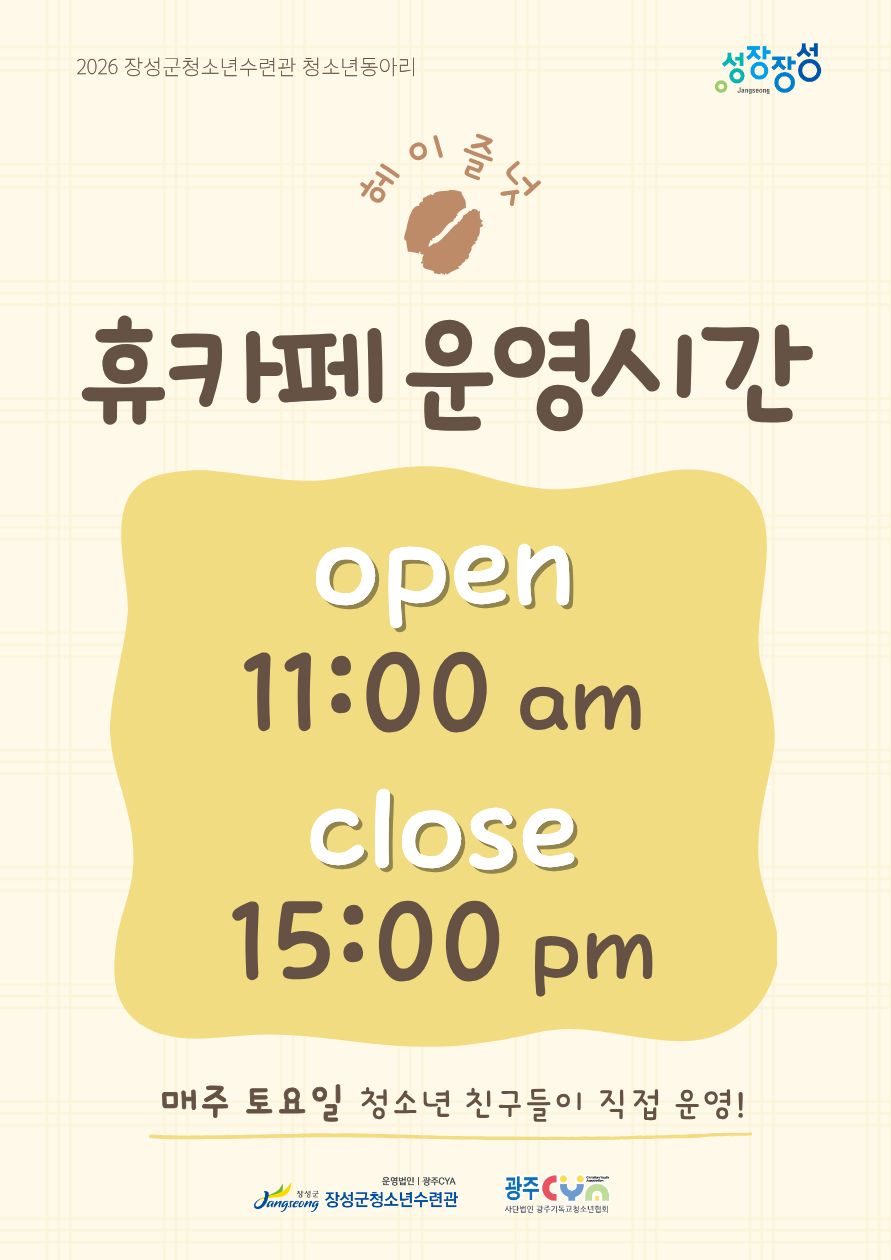 안녕하세요! 장성군청소년수련관입니다. 청소년 소속 동아리 헤이즐넛이 운영하는 휴카페가 드디어 오픈합니다! 현재는 임시 운영 기간으로 운영시간 : 오전 11시 ~ 오후 3시 2주 후부터는 작년과 동일하게 정상 운영될 예정입니다. 올해는 신규 동아리원으로 새롭게 구성되어 첫 활동을 시작합니다. 청소년들이 활동에 적응하는 기간이라 진행이 조금 느리거나 미숙할 수 있는 점 양해 부탁드립니다. 청소년들의 첫 시작에 따뜻한 응원과 많은 관심 부탁드립니다! |